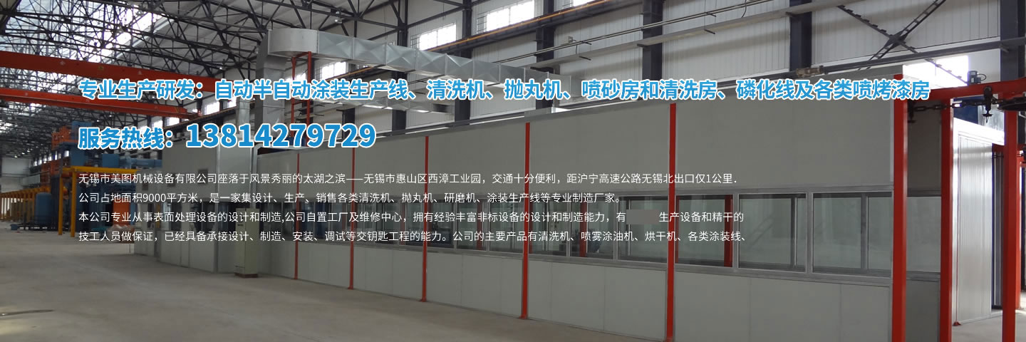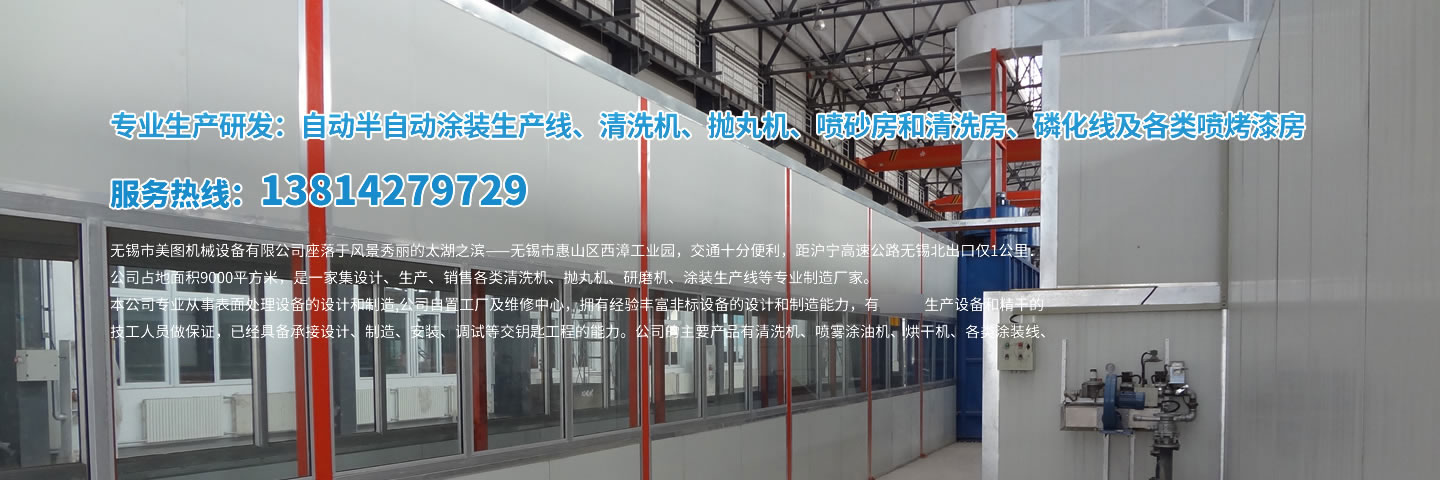 無(wú)錫市美圖機(jī)械設(shè)備有限公司座落于風(fēng)景秀麗的太湖之濱——無(wú)錫市惠山區(qū)西漳工業(yè)園,交通十分便利,距滬寧高速公路無(wú)錫北出口僅1公里.公司占地面積9000平方米,是一家集設(shè)計(jì)、生產(chǎn)、銷(xiāo)售各類(lèi)清洗機(jī)、拋丸機(jī)、研磨機(jī)、涂裝生產(chǎn)線(xiàn)等專(zhuān)業(yè)制造廠(chǎng)家。